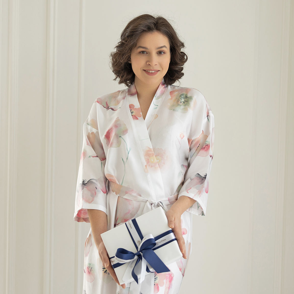 Модель: халат-кимоно, завязывается поясом на запах, имеет внутренние завязки и карманы в швах
