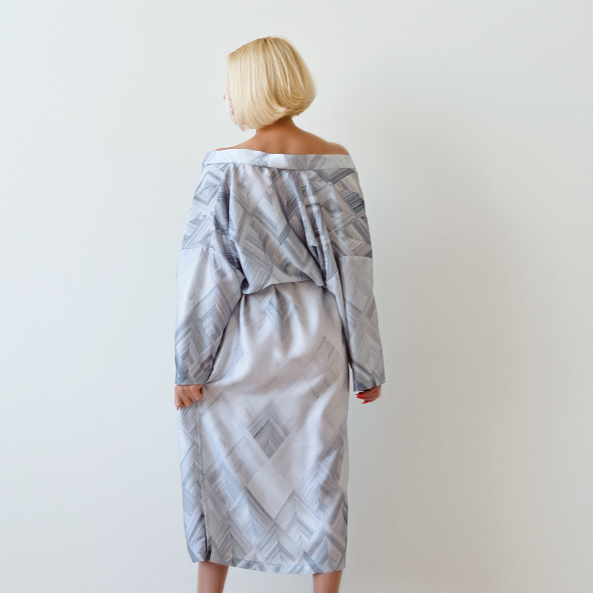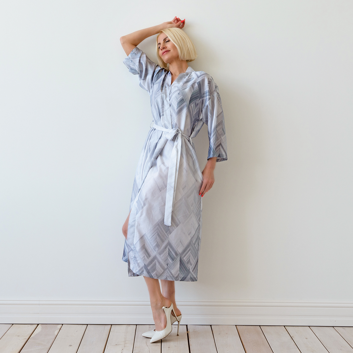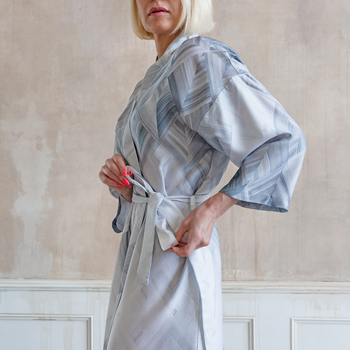 Модель: халат-кимоно, завязывается поясом на запах, имеет внутренние завязки и карманы в швах