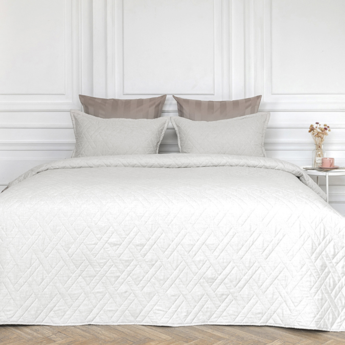 В комплект входит: покрывало на кровать 220x240 см и декоративные стеганые наволочки 50x70 см с ушками – 2шт. Состав: 60% вискозы и 40% хлопка, обеспечивает нежное прикосновение и комфортный сон. Покрывало имеет тактильно приятную Soft Touch фактуру и матовую поверхность для максимального комфорта. Не скользит, идеально принимает форму кровати.