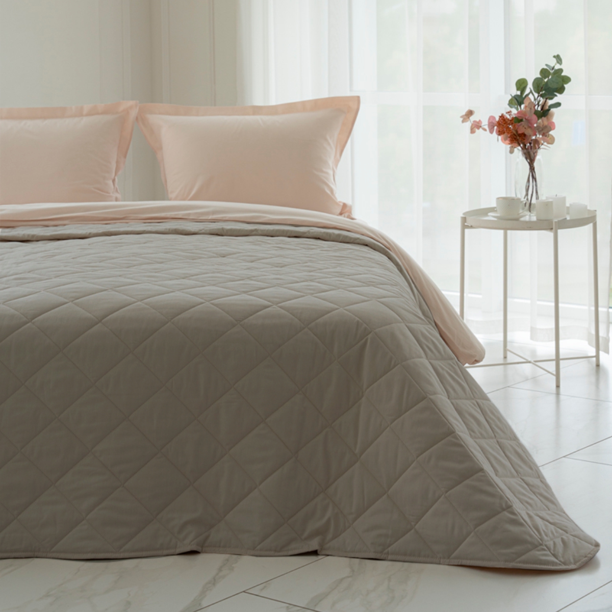 ОСОБЕННОСТЬ модели: хлопковое покрывало на кровать с закругленным уголком, практичной окантовкой по периметру изделия и стильной стежкой в виде ромбов. Верхняя и нижняя часть покрывала выполнены из высококачественного сатина - безопасного и натурального материала.