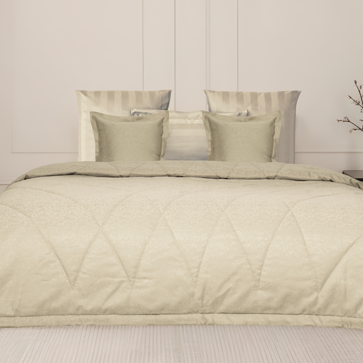 • Деликатная рельефность жаккарда создает изысканную игру света и тени, оживляя поверхность и наполняя её тактильным удовольствием.