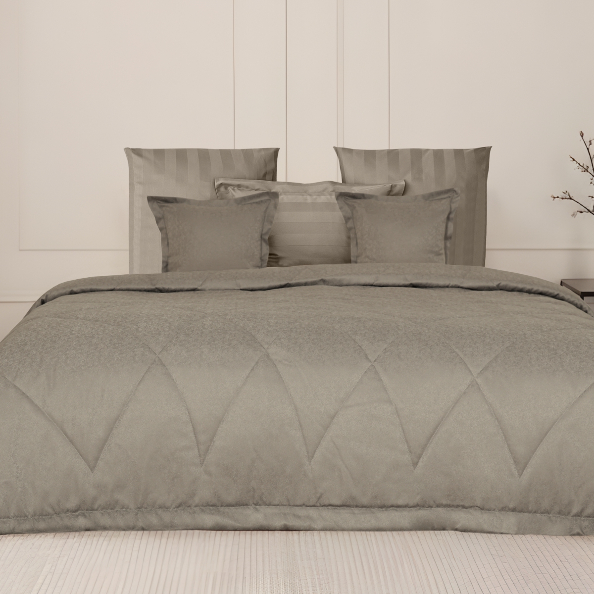 • Деликатная рельефность жаккарда создает изысканную игру света и тени, оживляя поверхность и наполняя её тактильным удовольствием.