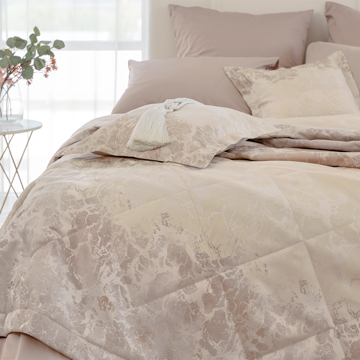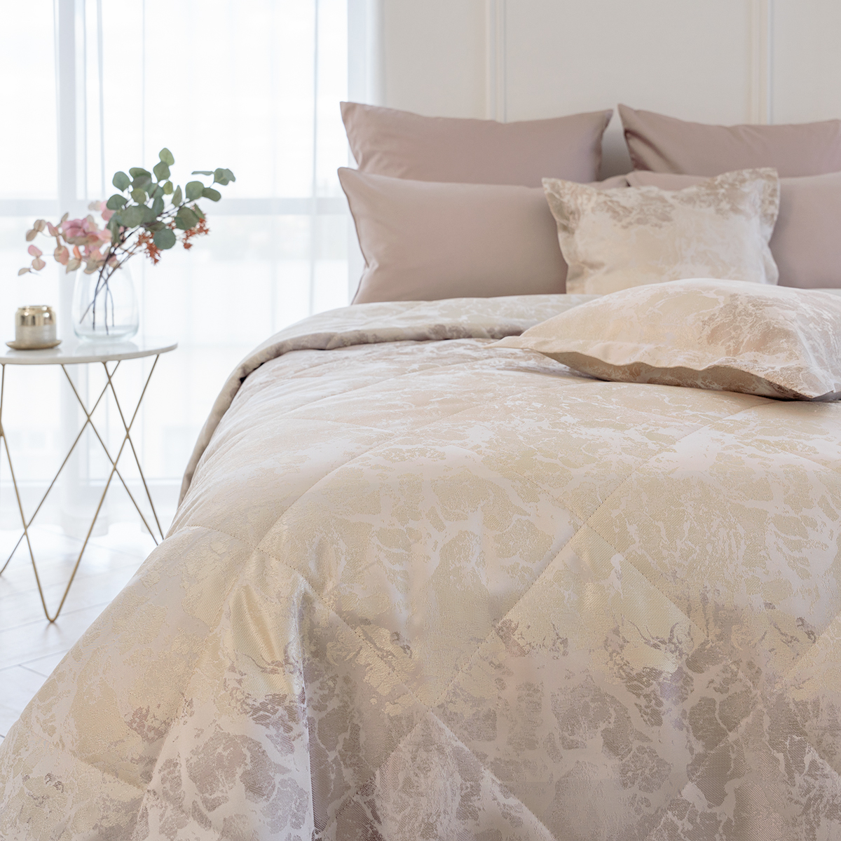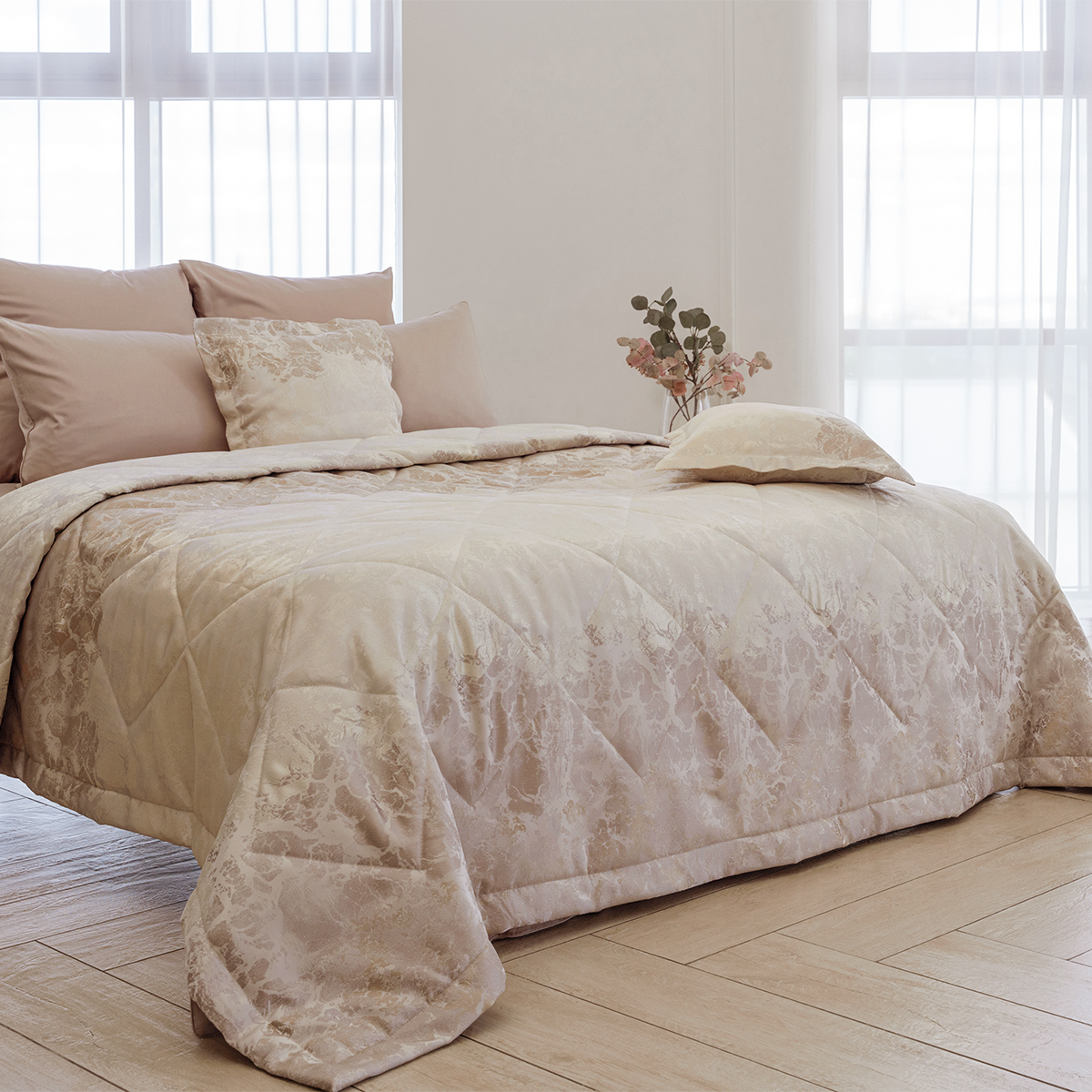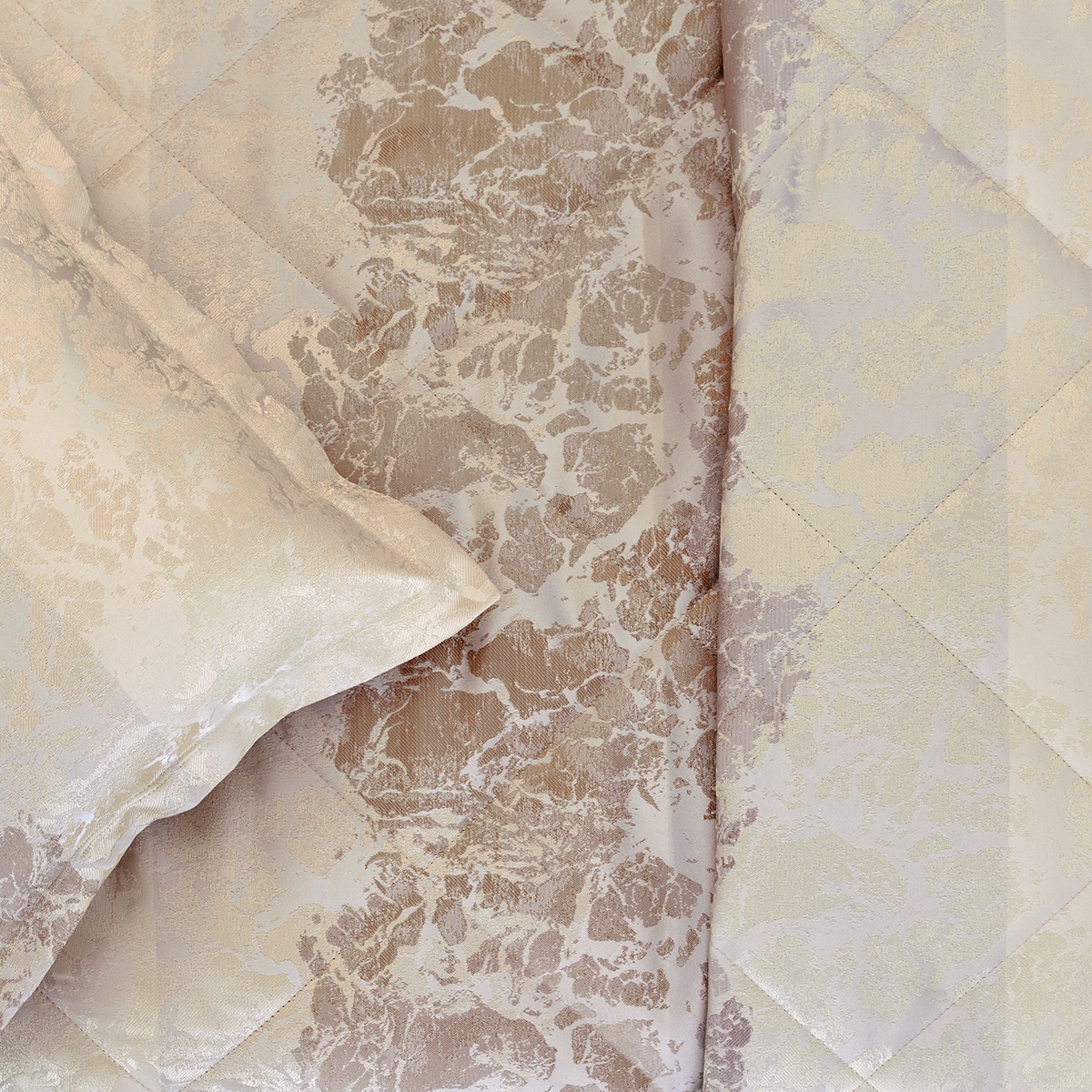 Состав: ткань портьерная 100% пэ, наполнитель - полиэфирное волокно. Стежка в виде ромбов. Подклад покрывала – микрофибра велюр, за счет своей фактуры он предотвращает скольжение покрывала на кровати.