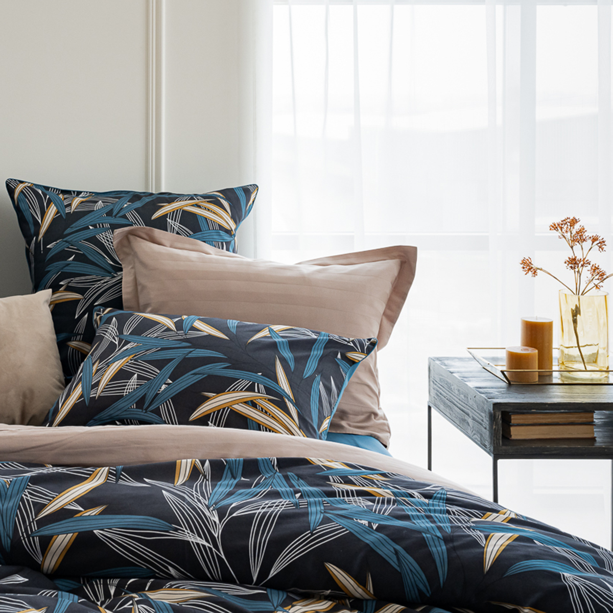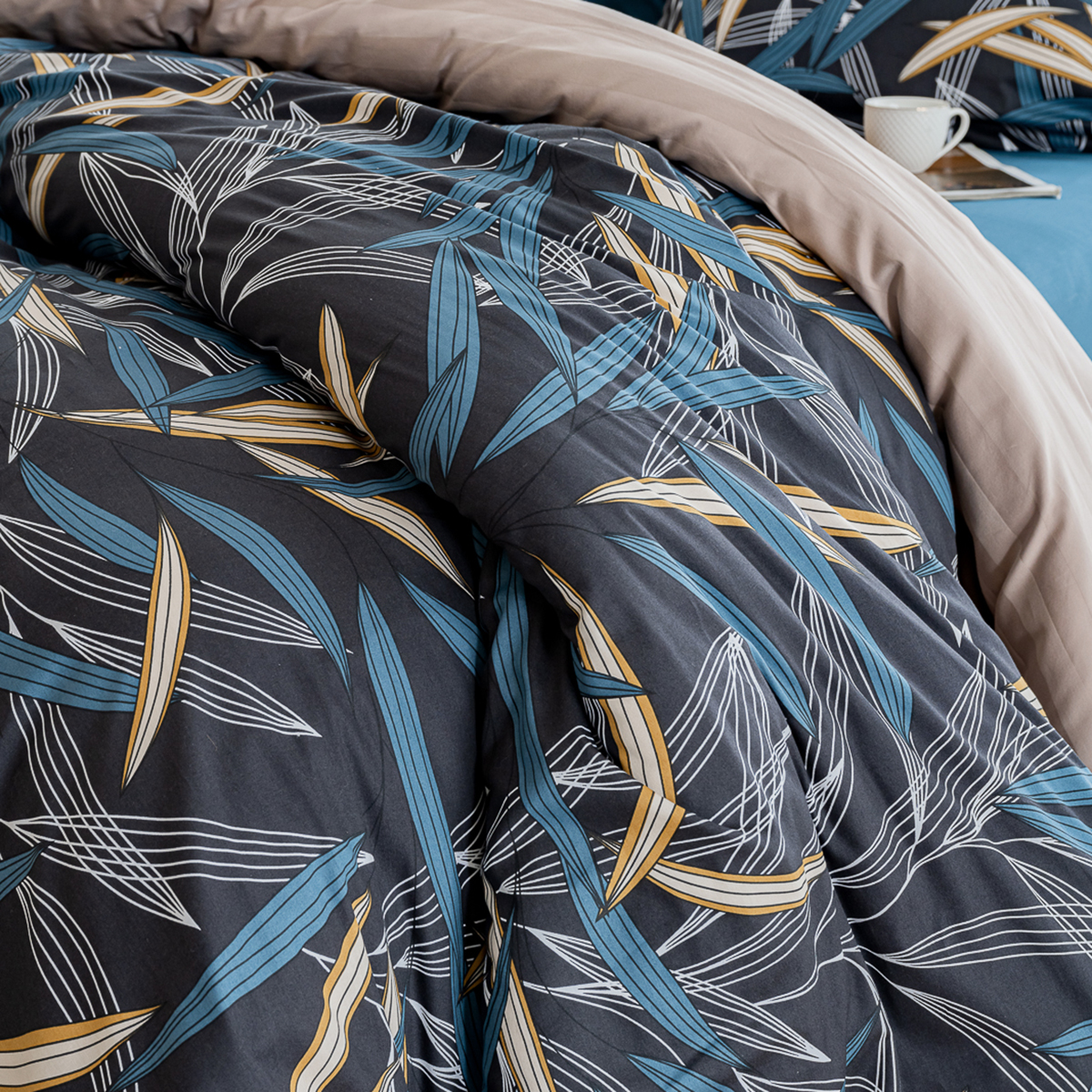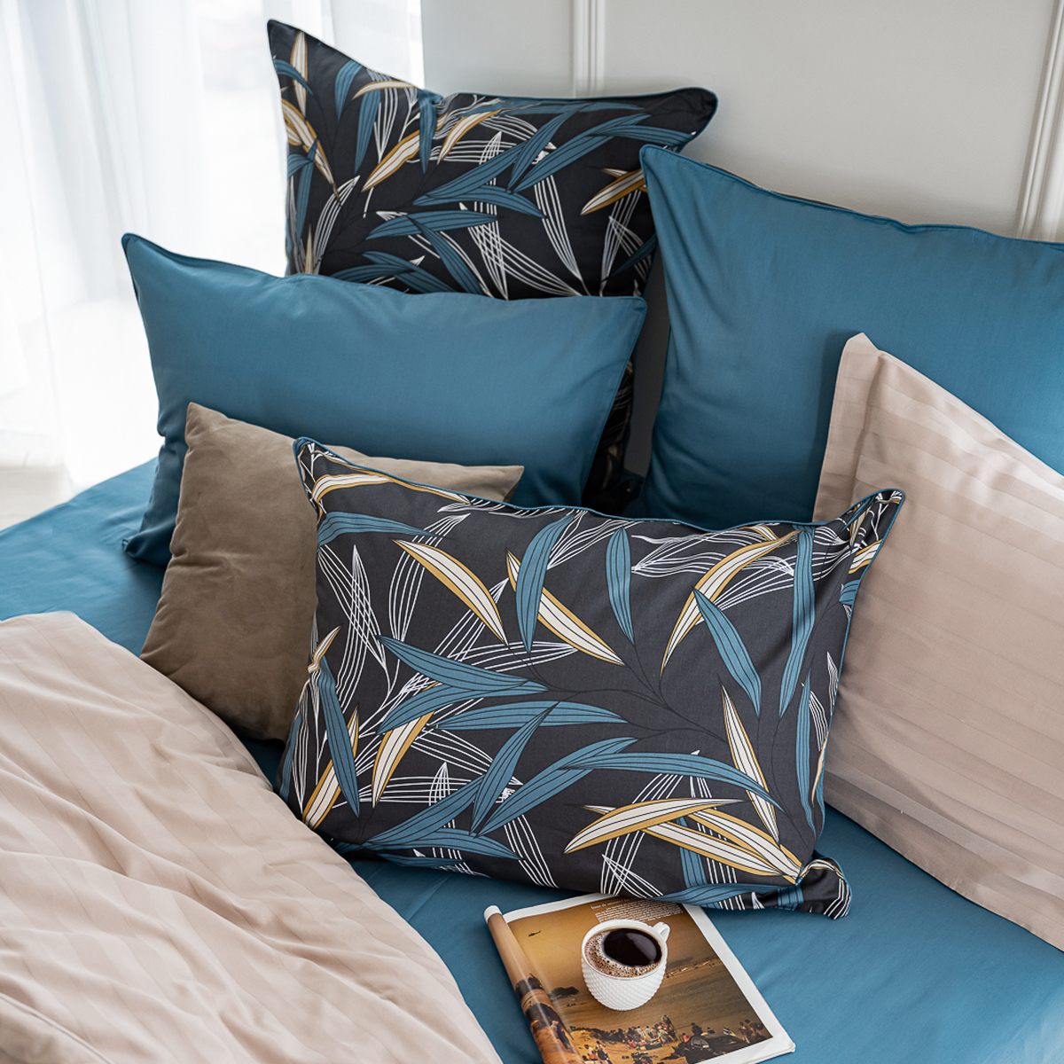 - Наволочки двухсторонние: лицевая сторона– растительный принт, оборотная – однотонная. Декоративный кант по трем сторонам наволочки.
