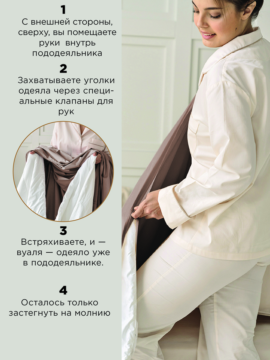 ПОДОДЕЯЛЬНИК С КЛАПАНАМИ ДЛЯ РУК — это то, с чем вы перестанете тяжело вздыхать при вдевании одеяла. Молния во всю ширину пододеяльника в цвет комплекта. Как это работает: