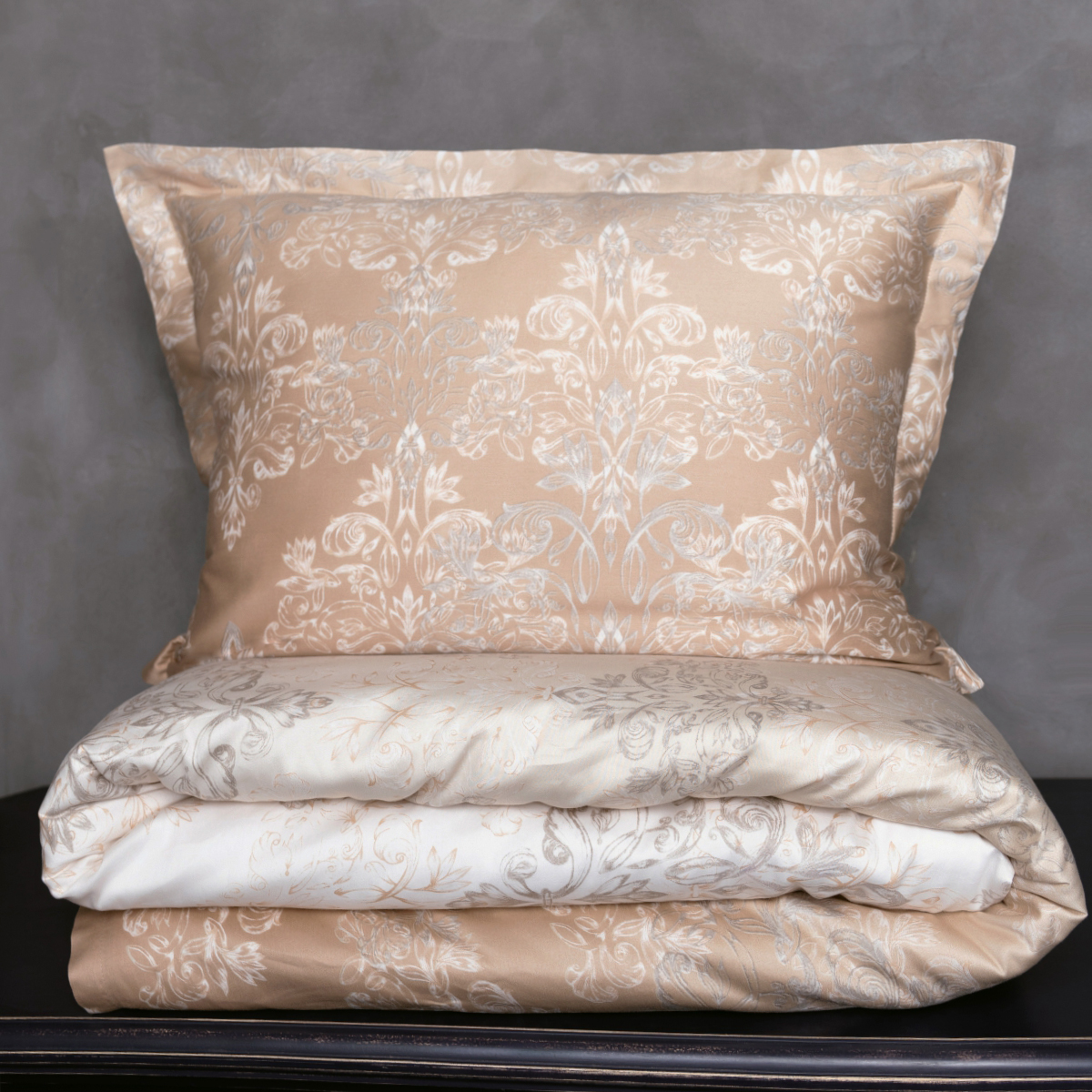 Роскошный комплект постельного белья Маргарет из люкс-сатина - благородная классика в мягких универсальных бежево-молочных оттенках. Роскошный дамасский узор притягивает внимание и добавляет изысканности в интерьер.