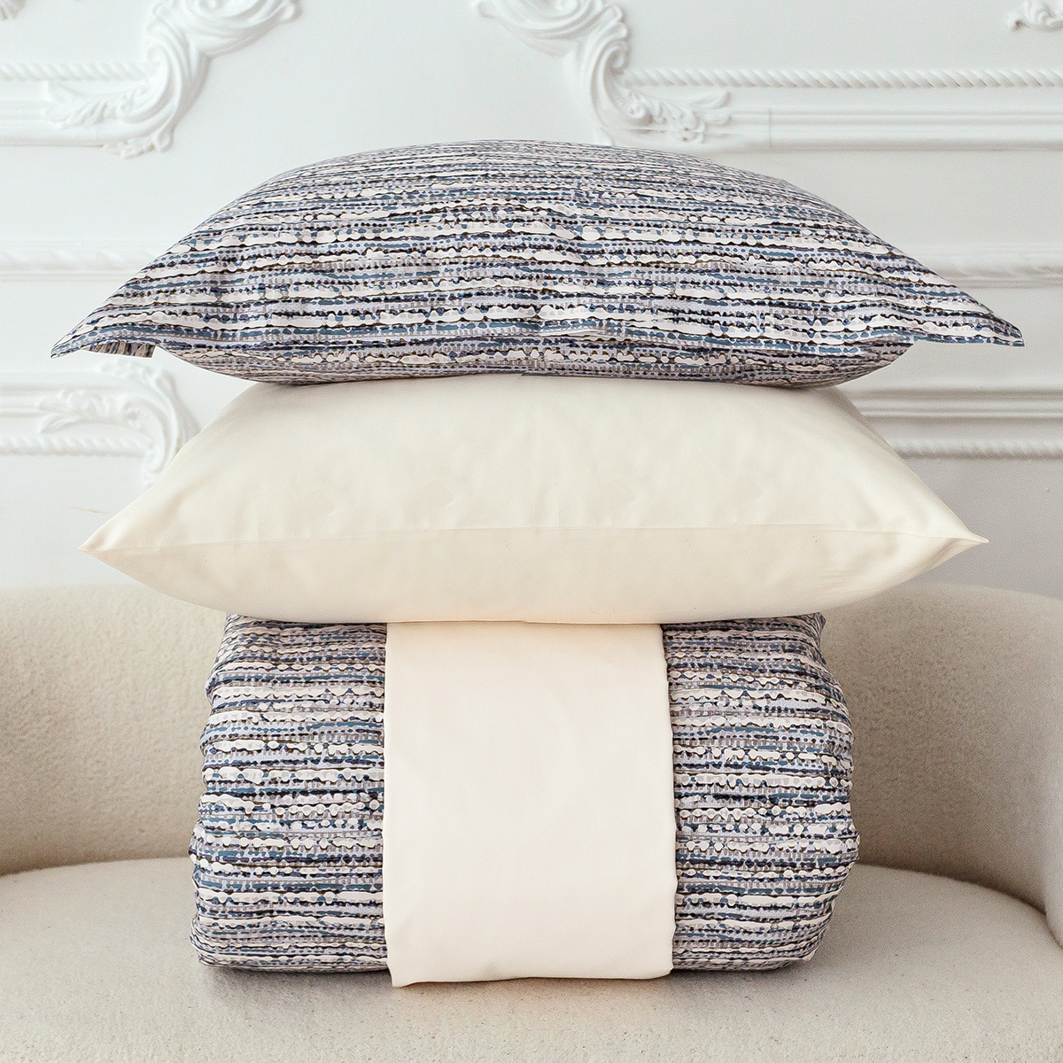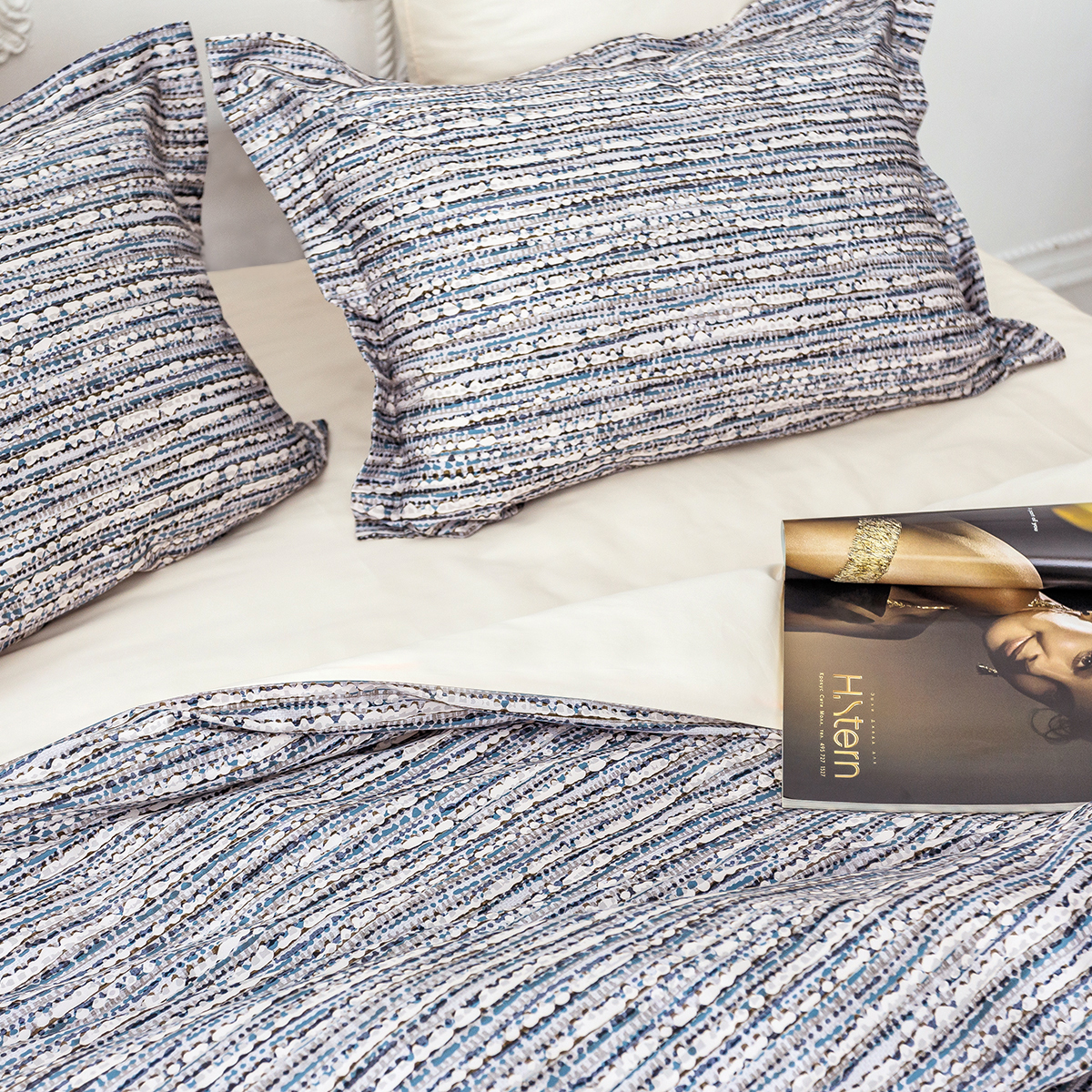«Данте» - изысканный текстурный узор напоминает спокойное море, чьи волны мягко перекатываются под легким ветром. Тонкие, плавные линии в сине-белой гамме создают ощущение глубины и умиротворения, идеально подходя для современного интерьера. Сдержанная палитра и минималистичный дизайн добавляют спальне уют и элегантность, не перегружая пространство.