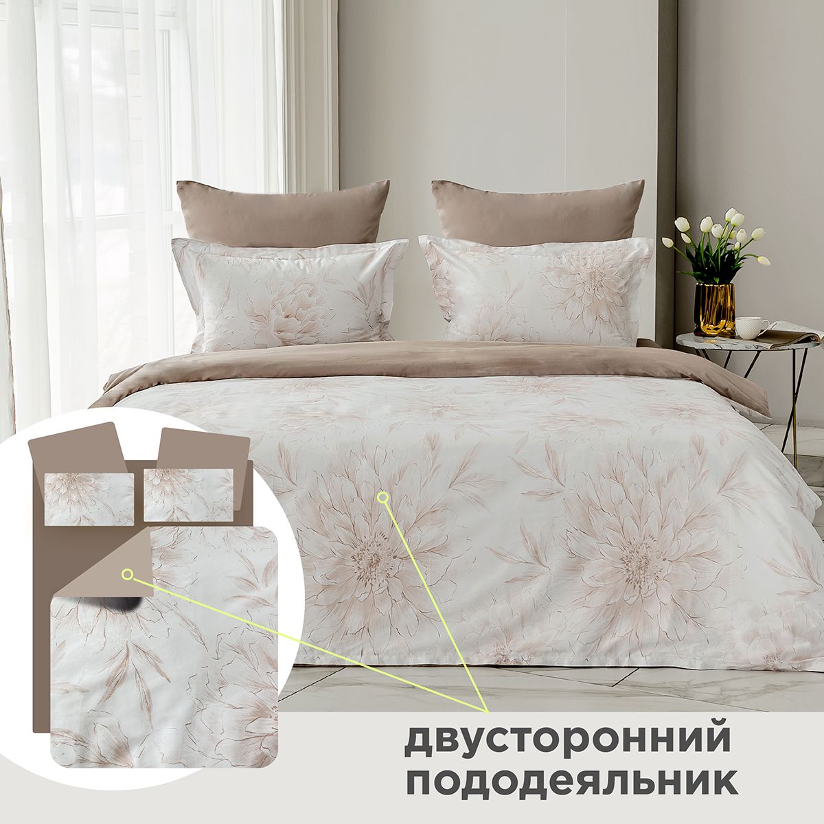 • «Невидимая» молния во всю ширину по нижнему краю пододеяльника. Для быстрой и удобной смены постельного белья в верхней части пододеяльника расположены клапаны для рук. Сменить пододеяльник можно за 30 секунд.