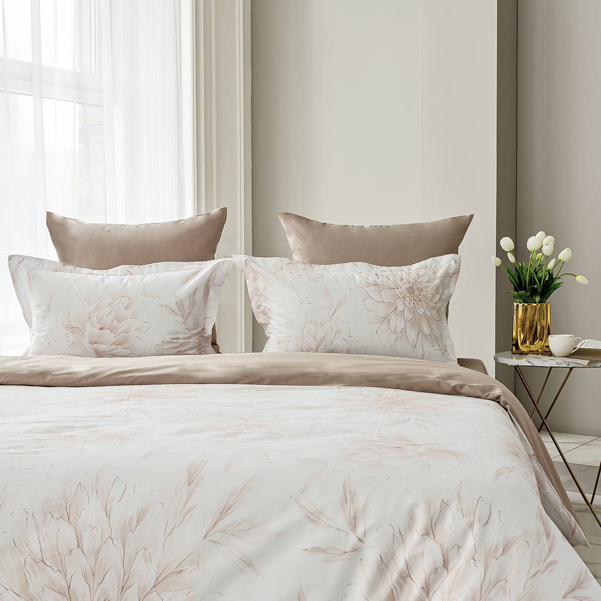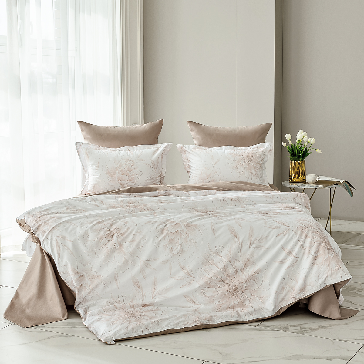 Роскошный 100% египетский хлопок высшего сорта, является самым экологически чистым в мире. В ткани мако-сатин, из которой произведена коллекция, используется более тонкая 60-я нить. Плотность ткани 300 ТС. За счет специальной скрутки нити, ткань получается очень мягкая и приятная на ощупь.