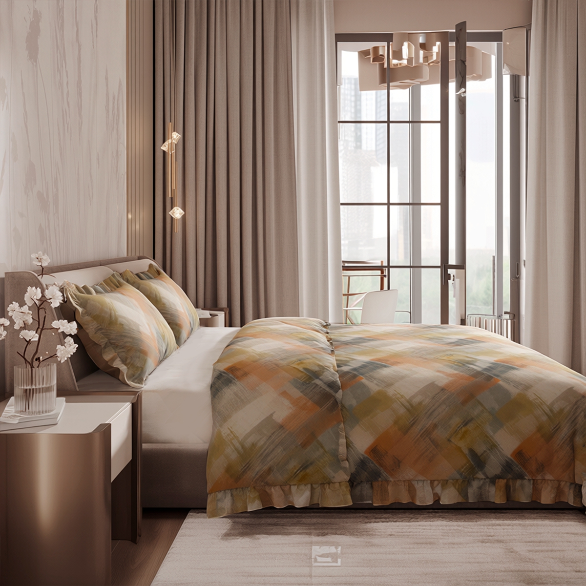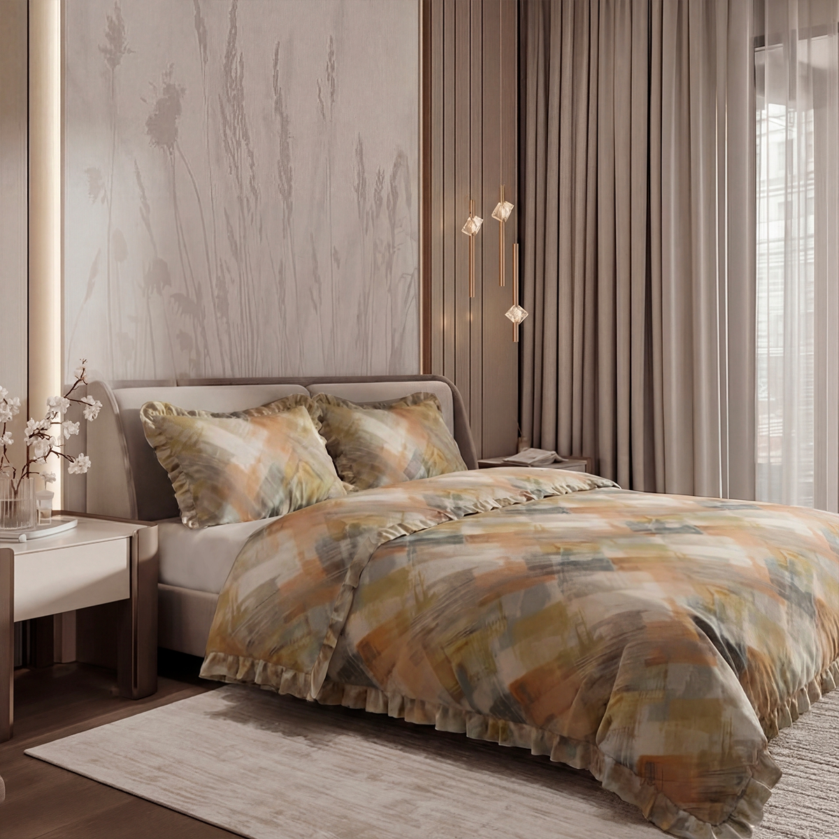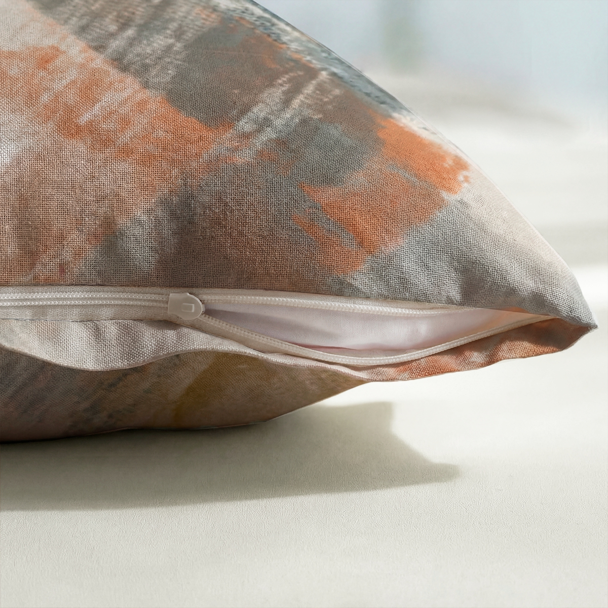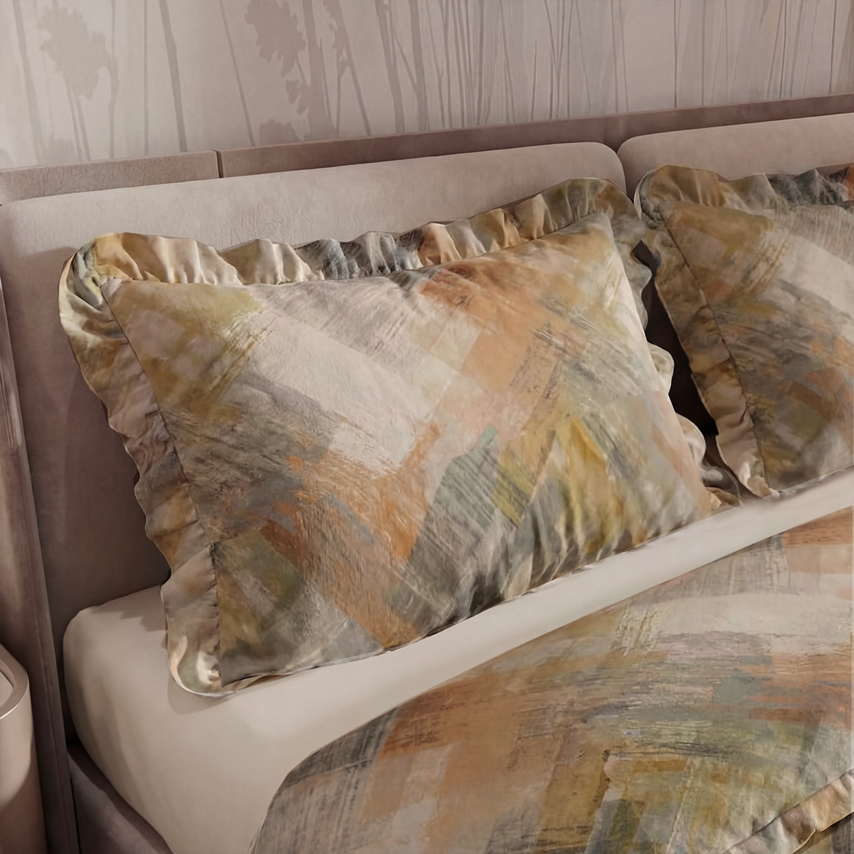 «Флоренсио»: Абстрактный принт, будто нарисованный широкой кистью. Сочетание оранжевого, серого, желто-зеленого и бежевого — это картина для вашей спальни. Энергичный, творческий, вдохновляющий на пробуждение.