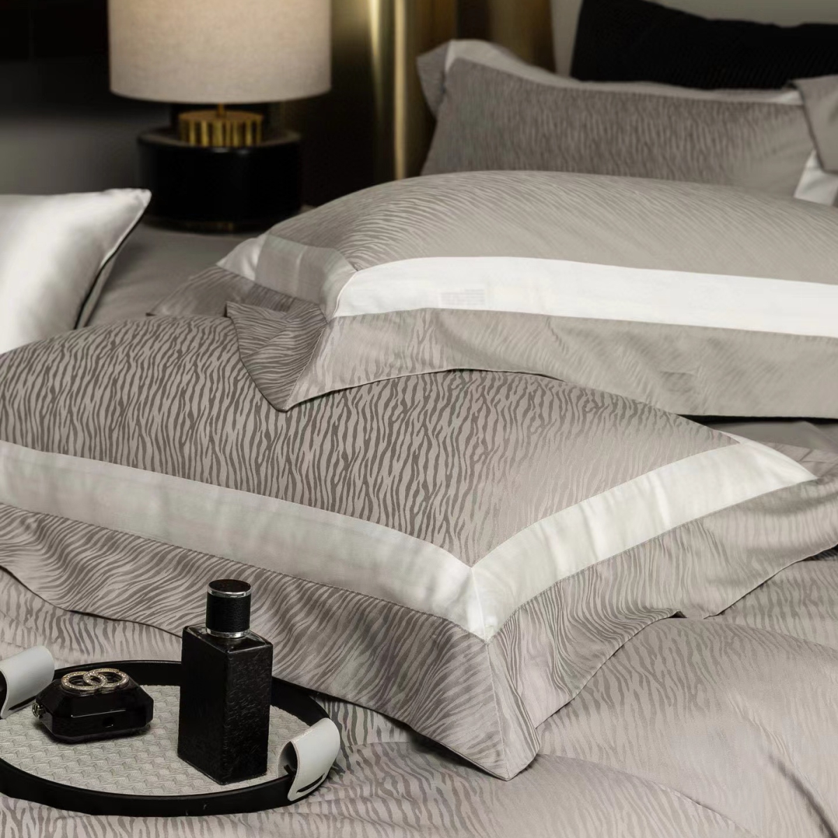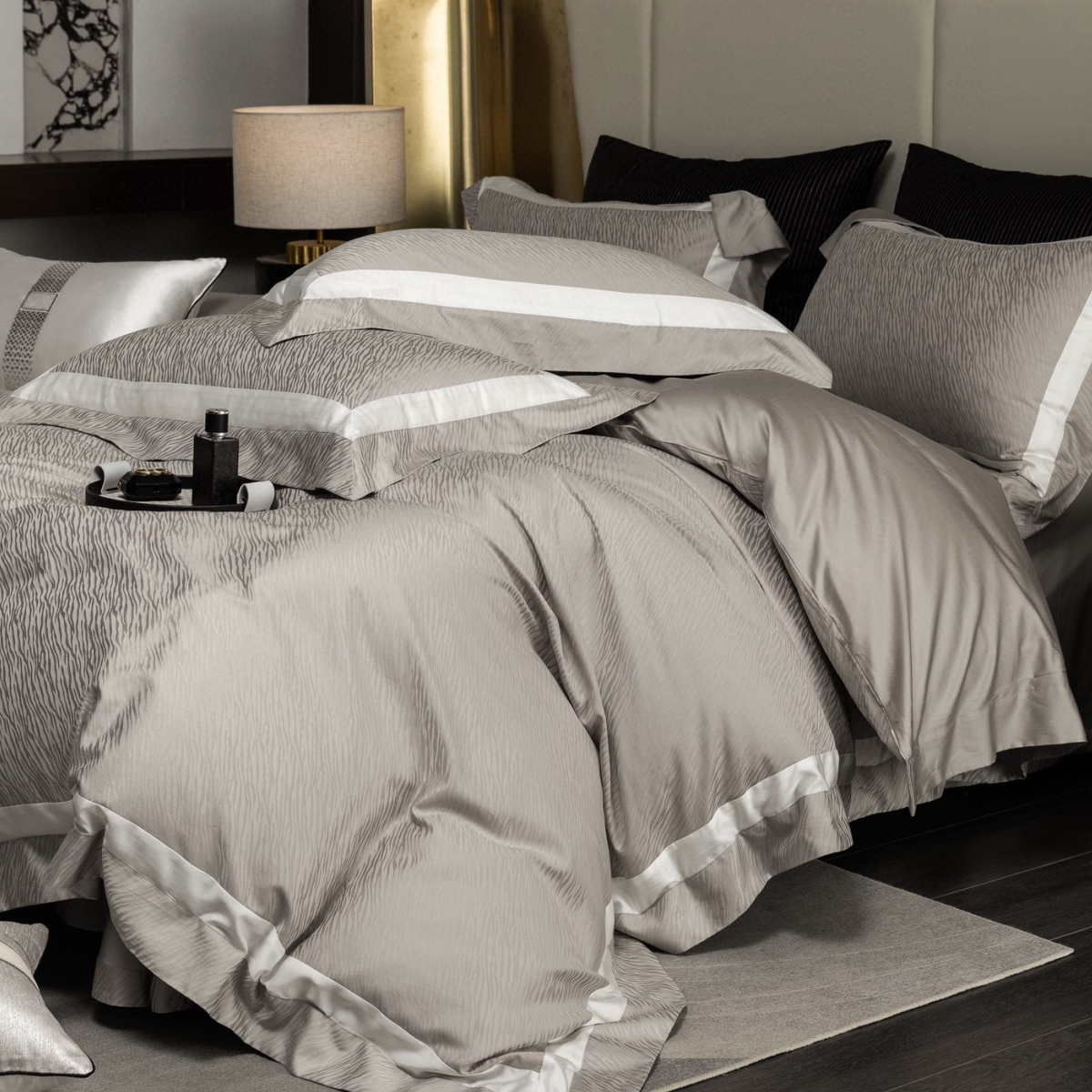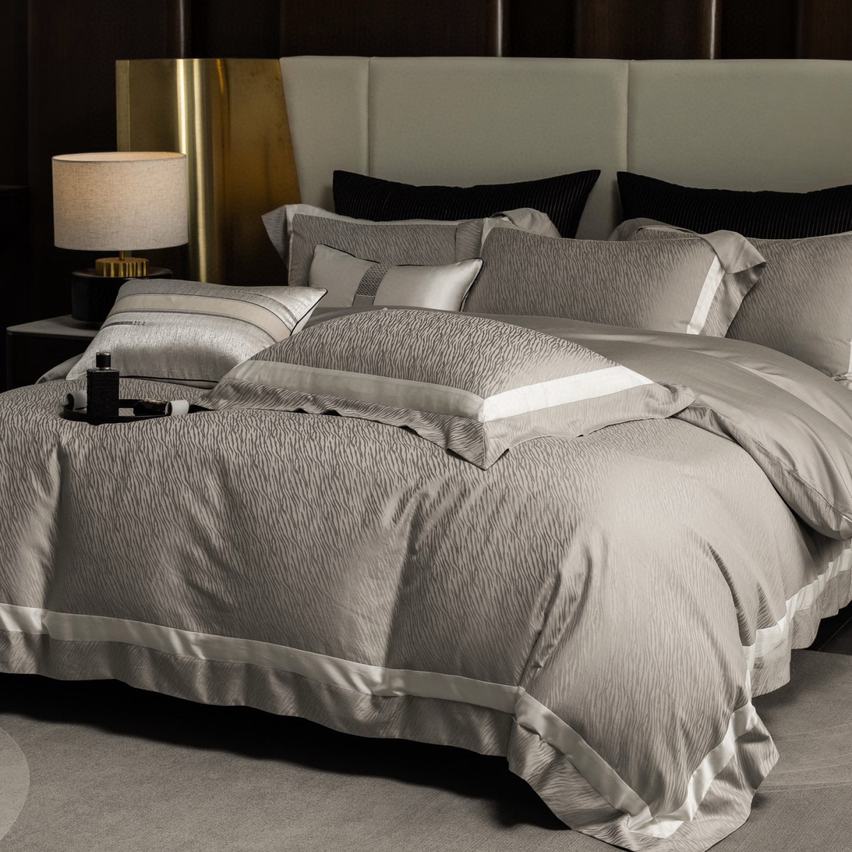 Кручёная нить придаёт материалу дополнительную прочность и создаёт эффект благородного сияния. Добавление шёлка усиливает тактильные ощущения: ткань остаётся прохладной на ощупь, но тёплой в объятиях, а её уникальная способность подстраиваться под тело делает отдых особенно комфортным.